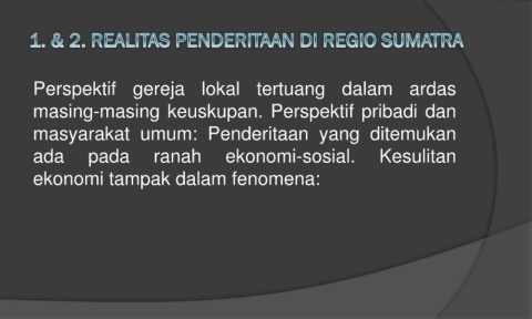 Perspektif gereja lokal tertuang dalam ardas masing-masing keuskupan. Perspektif pribadi dan masyarakat umum: Penderitaan yang ditemukan ada pada ranah ekonomi-sosial. Kesulitan ekonomi tampak dalam fenomena: