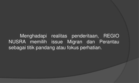 Menghadapi realitas penderitaan, REGIO NUSRA memilih issue Migran dan Perantau sebagai titik pandang atau fokus perhatian.